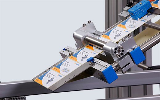 Produkt je možné umiestniť na dopravník ručne – alebo voliteľne pomocou dávkovacieho otočného stola (záleží na type produktu). Produkt najskôr stretne triediaci mechanizmus, ktorý môže byť napríklad horný mechanický, bočný pneumatický alebo bočný otočný mechanizmus. Tento mechanizmus znižuje šírku dopravníka (nastaviteľné manuálne) a s regulovateľnou rýchlosťou otáčania pomaly spomaľuje rýchlosť produktu na dopravníku, čím zabraňuje zdržovaniu produktu na etiketovacom mieste. Vďaka triediacemu mechanizmu nedochádza ani pri nepretržitom podávaní k zablokovaniu etikety.